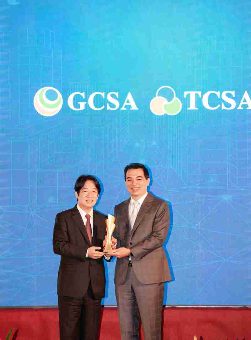 达全方位永续表现获全球永续奖及台湾永续奖肯定,,,,由副总统赖清德颁奖 (左),,牛牛游戏总经理柯富仁 (右) 代表领奖