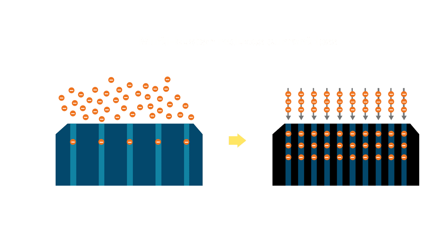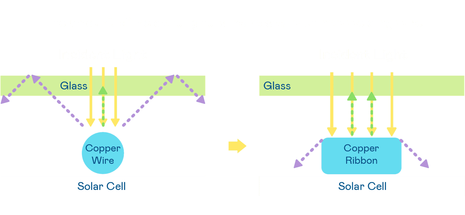 - 电池使用多条铜导线 (Copper wire) 于电池片上形成较短的电流路径,,提高电流收集效率,,,采用圆形设计的铜导线较传统扁平式的铜焊带 (Ribbon),,可增加入射至电池的光线量。。。。