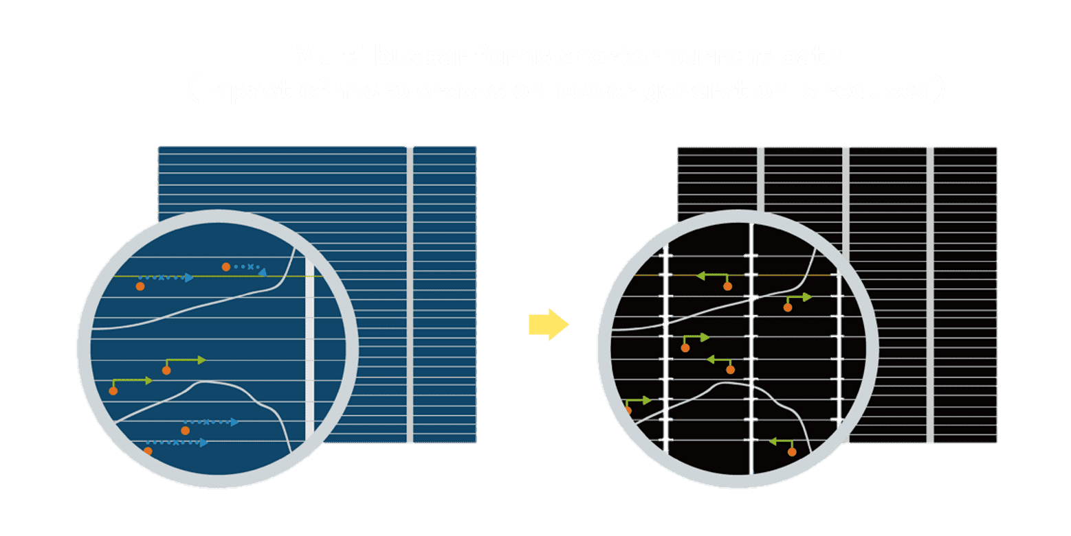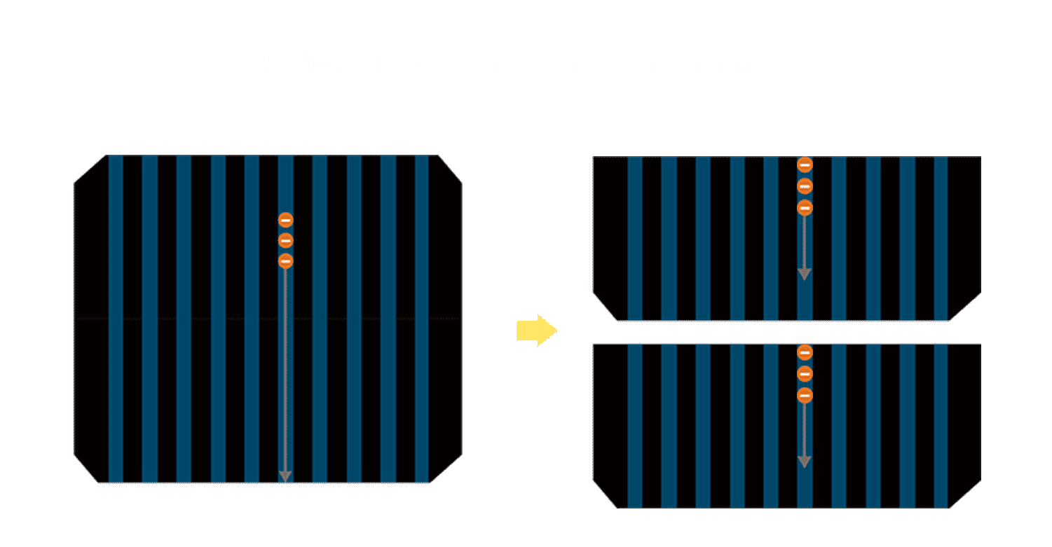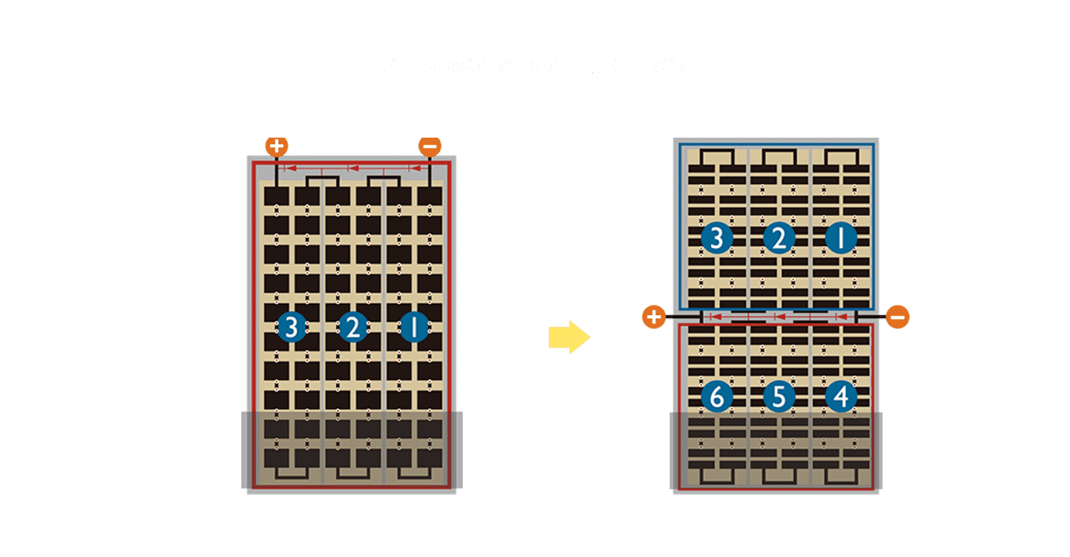 - 结合半切电池,,,,降低遮阴影响、、、、提升模组抗隐裂能力、、并减少电阻损耗,,进一步提升模组发电效能。。。。