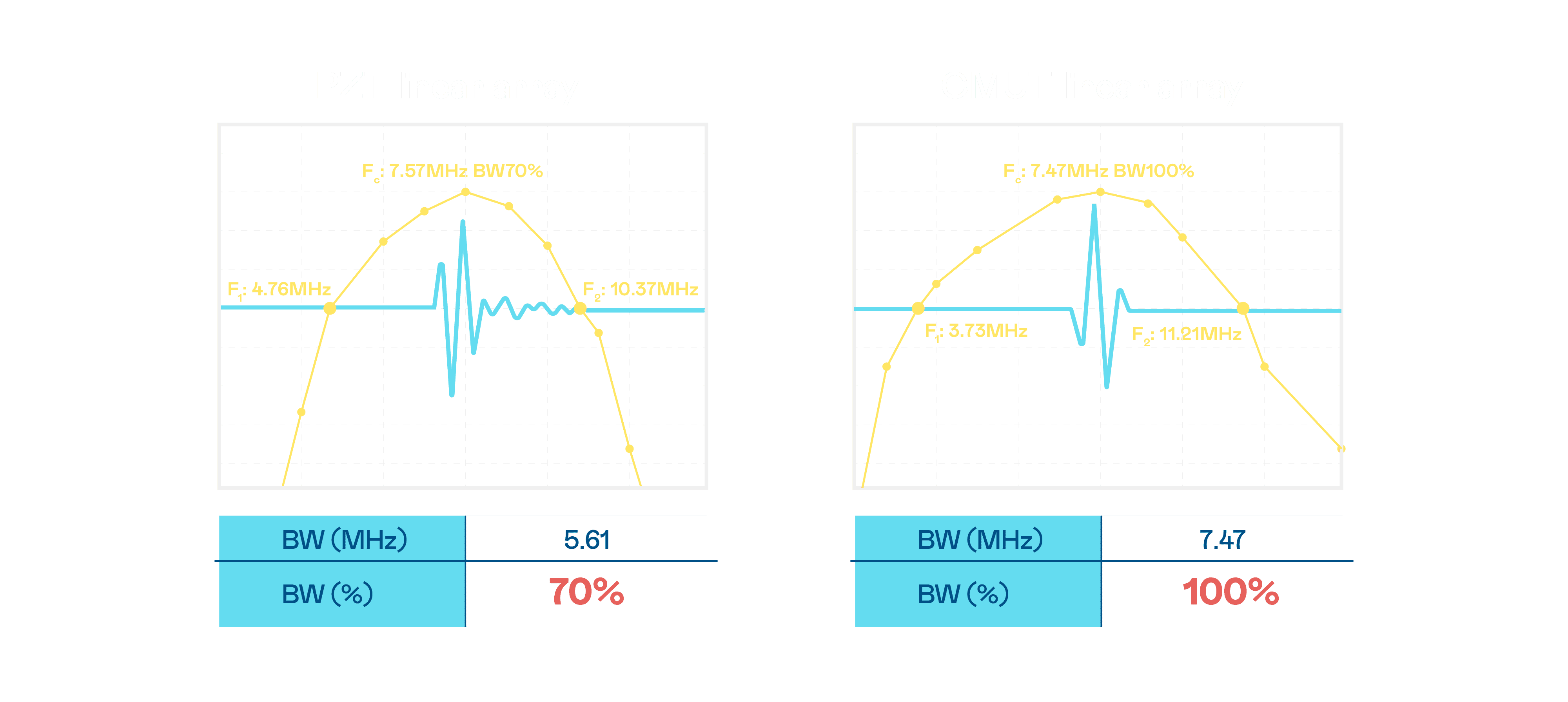 超音波影像的解析度高低,,,,首先取决于探头能发出的讯号频宽。。牛牛游戏 CMUT 可提供高清晰的超音波讯号,,,提供高频宽、、、高灵敏度、、影像纹理细节更高的超音波影像,,,协助医护人员缩短影像判读时间及利用精准的医疗影像进行诊断。。。